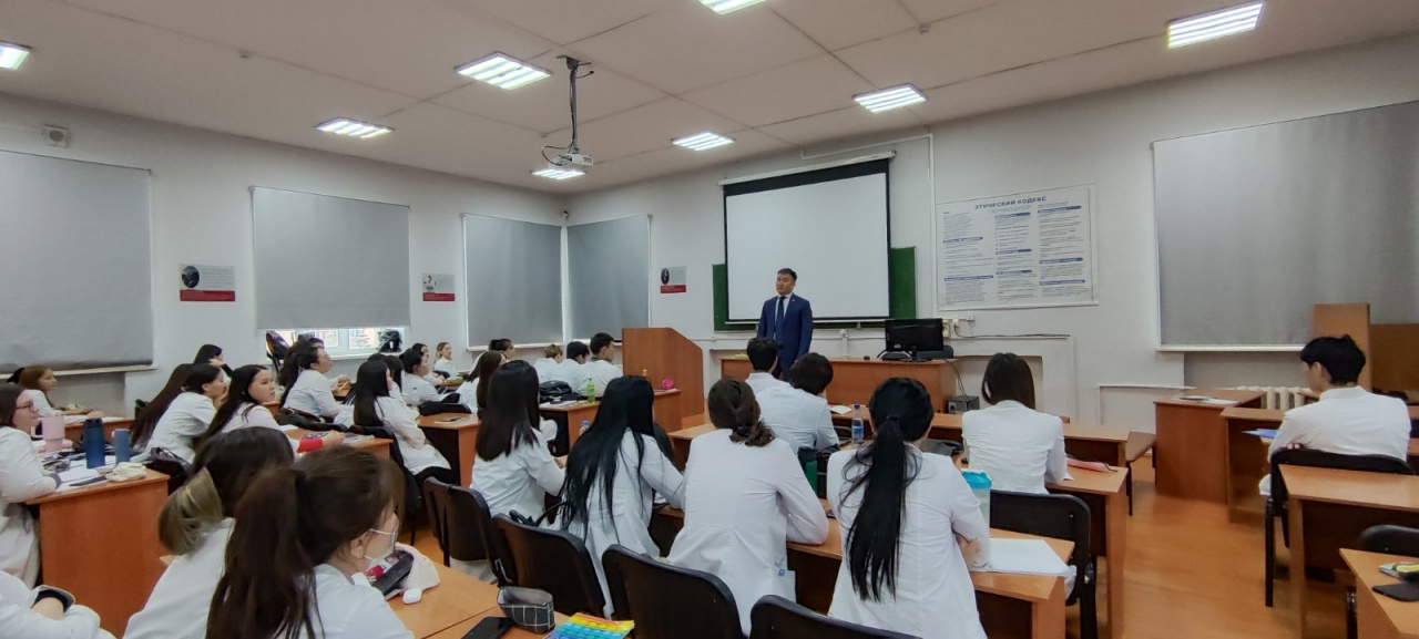 Со студентами встретились врачи Республиканской клинической больницы им. Н.А. Семашко: выпускники МИ БГУ Мардаев Булат и Гармаев Баир.