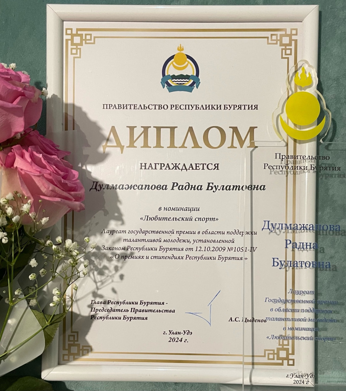 «Хочу выразить глубокую благодарность за получение такой важной награды – госпремии по Талантливой молодежи в республике Бурятия. Эта награда стала возможной благодаря непрерывной поддержке и мудрости моих тренеров, наставников и руководителей, которые всегда были рядом и поддерживали меня на этом пути. Искренне благодарю Кожевникову Викторию Юрьевну, моего преподавателя по физической культуре. Ваша вера в мои силы и предоставленные возможности тренироваться в любое время вдохновили меня достигать новых высот. Я искренне ценю вашу поддержку и заботу.