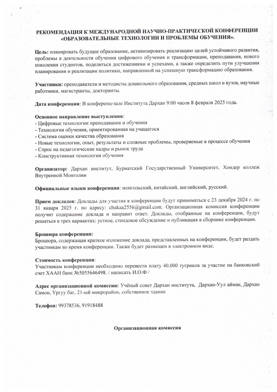 Дархан Институт приглашает принять участие в международной научной конференции "Образовательные технологии и проблемы обучения", которая состоится 08 февраля 2025 г. в конференц-зале Института Дархан. С более подробной информацией по участию в конференции можно ознакомиться в прикрепленном файле.