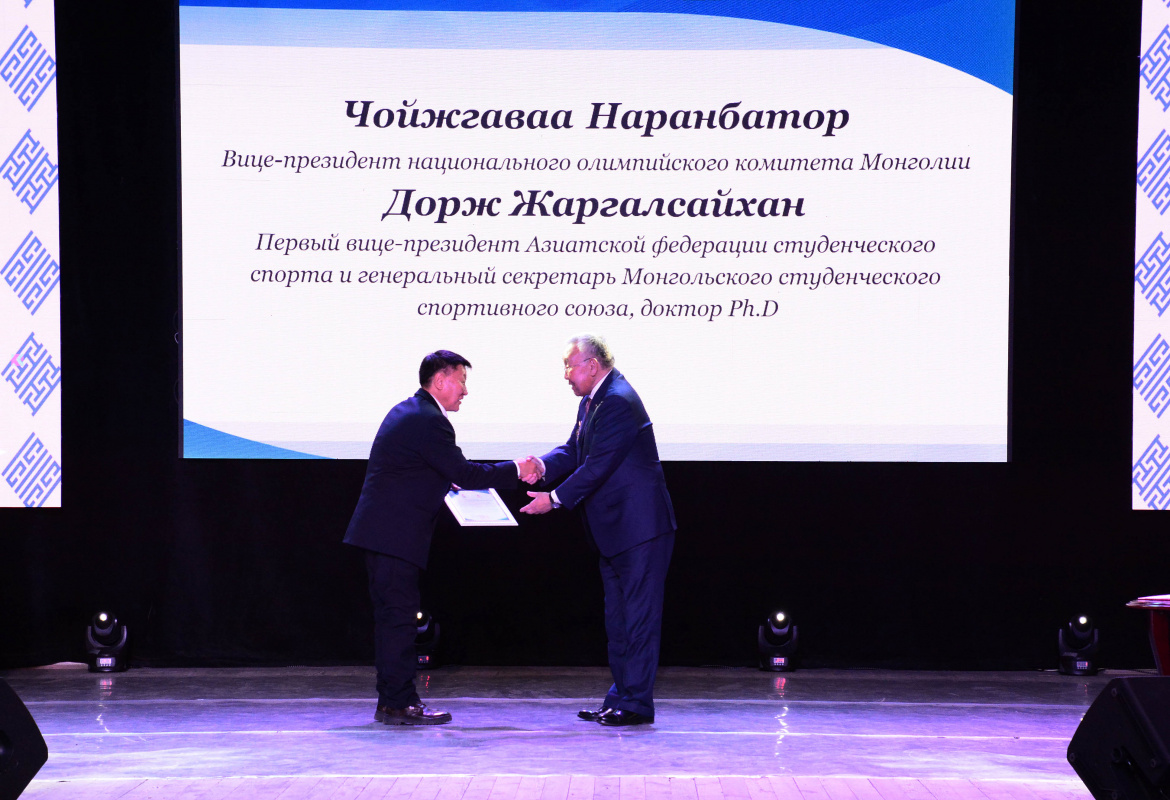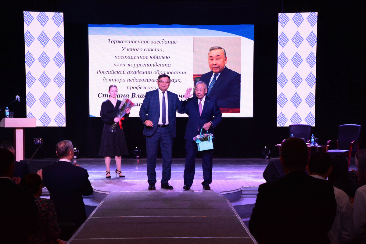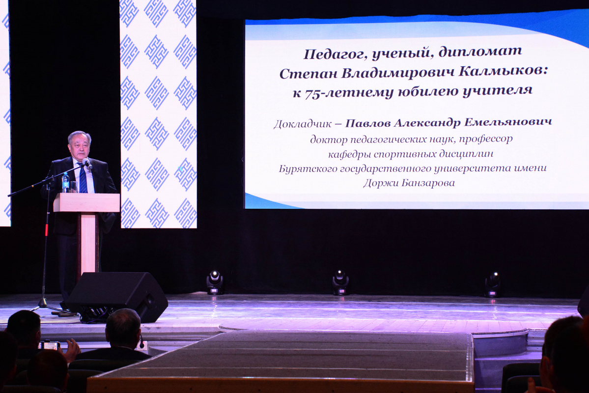 Первый ректор БГУ достиг серьезных успехов на общественном поприще, научной и образовательной ниве, воспитал достойных учеников. Сегодня этот капитал является предметом гордости университета и фундаментом прочной репутации. На торжественном заседании Ученого совета университета с официальными поздравлениями выступили ректор БГУ А. В. Дамдинов, профессоры Ц. З. Доржиев, А. Е. Павлов, Председатель Комитета Государственной думы по физической культуре и спорту Федерального собрания РФ, Президент Федерации студенческого спорта России, профессор О. В. Матыцин, председатель Комитета Народного Хурала республики Бурятия по социальной политике И. В. Марковец, герой Монголии, двенадцатикратный чемпион по национальной борьбе «Наадам» Бадмаанямбуугийн Бат-Эрдэни, вице-президент национального олимпийского комитета Монголии Чойжгаваа Наранбатор, первый вице-президент Азиатской Федерации студенческого спорта и генеральный секретарь Монгольского студенческого спортивного союза Дорж Жаргалсайхан. С официальным поздравлением к юбиляру также обратился мэр муниципального образования «Осинский район» Иркутской области Б. М. Хошхоев. Земляки С. В. Калмыкова привезли самый горячий привет с малой родины уважаемого юбиляра и подарили вороного жеребца шанайской породы.