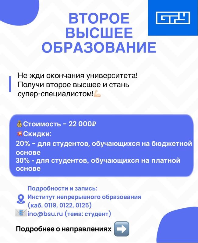 Институт непрерывного образования БГУ предлагает студентам получить второе образование за время обучения по основной профессиональной программе.