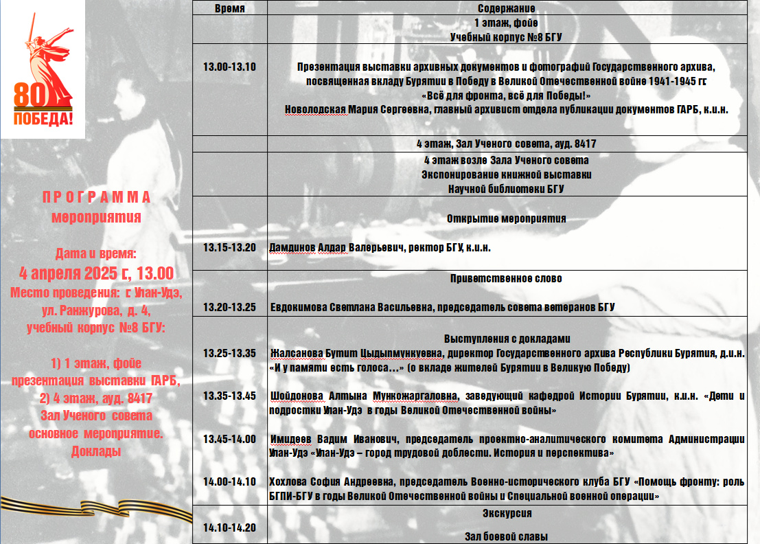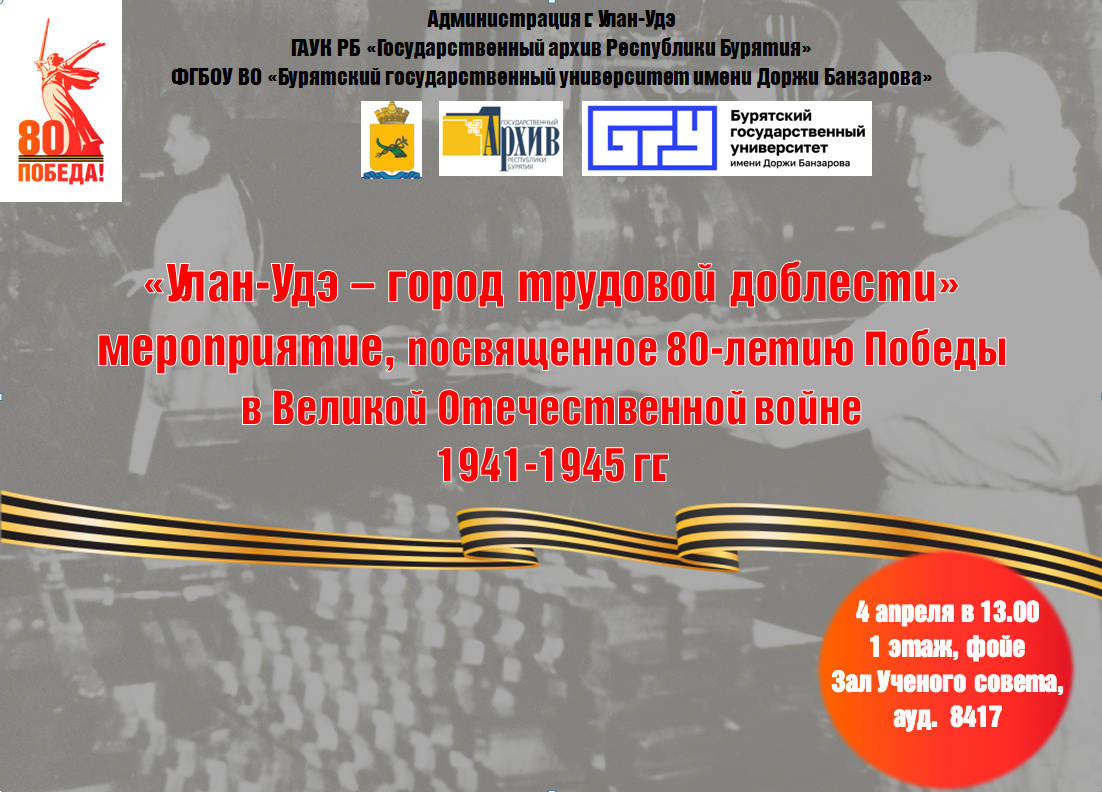 Визитно-информационный центр БГУ приглашает Вас на мероприятие, посвященное 80-летию Победы в Великой Отечественной войне «Улан-Удэ - город трудовой доблести», которое состоится 4 апреля 2025 года в 13:00.