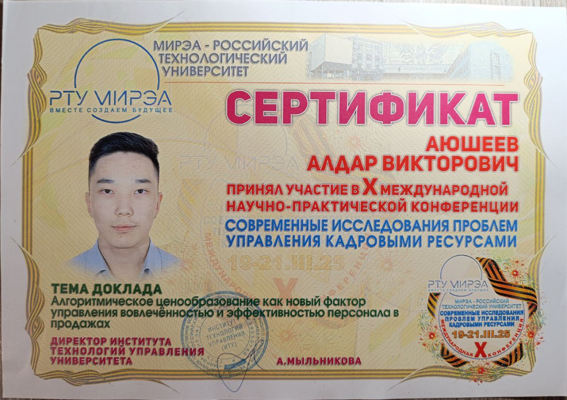 Аюшеев Алдар, студент 1 курса магистратуры по направлению "Экономика" Института права и экономики (группа 07140м), принял участие в X международной научно-практической конференции "Современные исследования проблем управления кадровыми ресурсами", проходившей в Российском технологическом университете (РТУ МИРЭА) в г. Москва с 19 по 21 марта 2025 года. Мероприятие было посвящено 80-летию Победы в Великой Отечественной войне.
