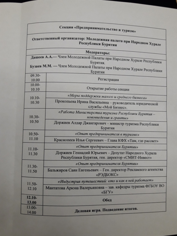Были освещены меры поддержки малого и среднего бизнеса в Бурятии, в том числе, через грантовые проекты Правительства республики; рассмотрен личный опыт предпринимателей, занятых с сфере туризма, строительства, рекламы и фермерского хозяйства. Студенты приняли участие в деловой игре, посвященной экспресс-разработке стартапов в области туризма и отдыха в Бурятии. Мероприятие прошло продуктивно и с пользой для всех.
