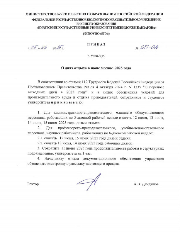 В соответствии со статьей 112 Трудового Кодекса Российской Федерации от Постановлением Правительства РФ от 4 октября 2024 г. N 1335 "О переносе выходных дней в 2025 году" и в целях обеспечения условий для производительного труда и отдыха преподавателей, сотрудников и студентов университета приказываю: