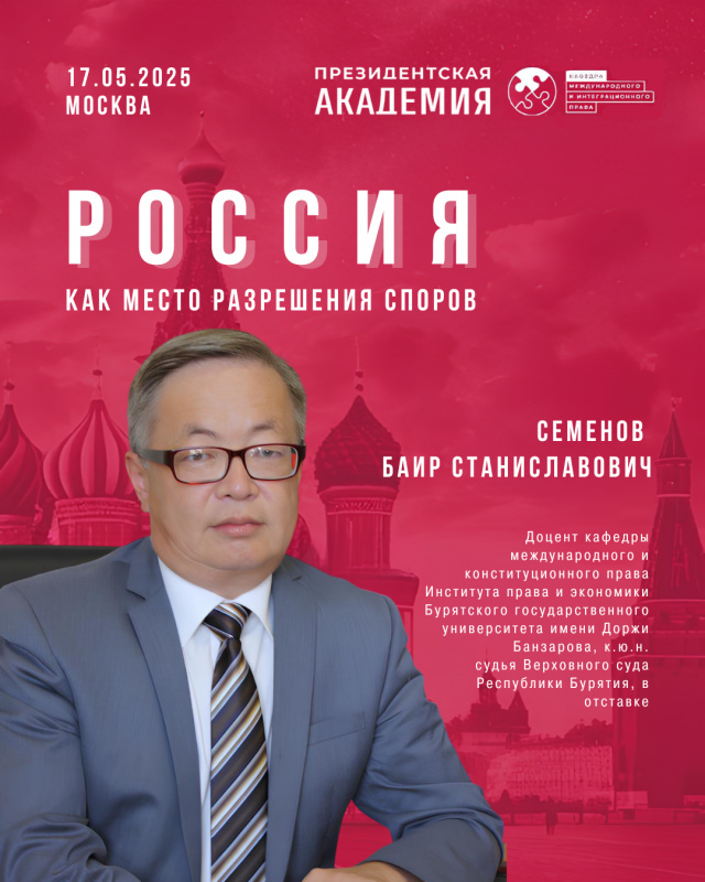 17 мая директор Института права и экономики БГУ Раднаева Э.Л. и доцент кафедры конституционного и международного права Семенов Б.С. дистанционно приняли участие в Круглом столе - дискуссионной панели «Россия как место разрешения споров: импортозамещение в арбитраже», организованном кафедрой международного права и интеграционных процессов Юридического факультета им. М.М. Сперанского Института права и национальной безопасности Российской академии народного хозяйства и государственной службы при Президенте РФ.