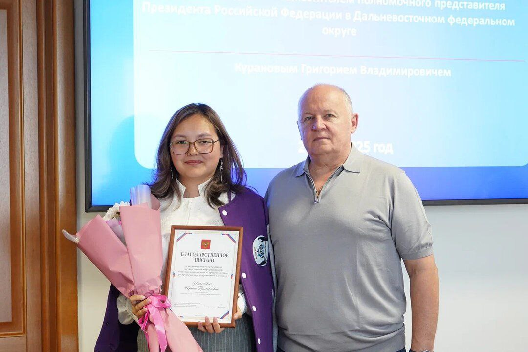 В завершение встречи Григорий Владимирович Куранов вручил благодарственные письма следующим студентам: Макаровой Диане, Номогоевой Алине, Цыреновой Юлии, Петрову Алексею, Бабошину Евгению, Унагаевой Ирине и Бухольцевой Анастасии. Тем самым отмечая их активное участие в реализации государственной информационной политики. Эти письма стали символом признания важности работы киберволонтеров и вдохновением для дальнейшего участия в подобной деятельности, подтверждая, что молодое поколение действительно готово взять на себя ответственность за будущее своей страны.