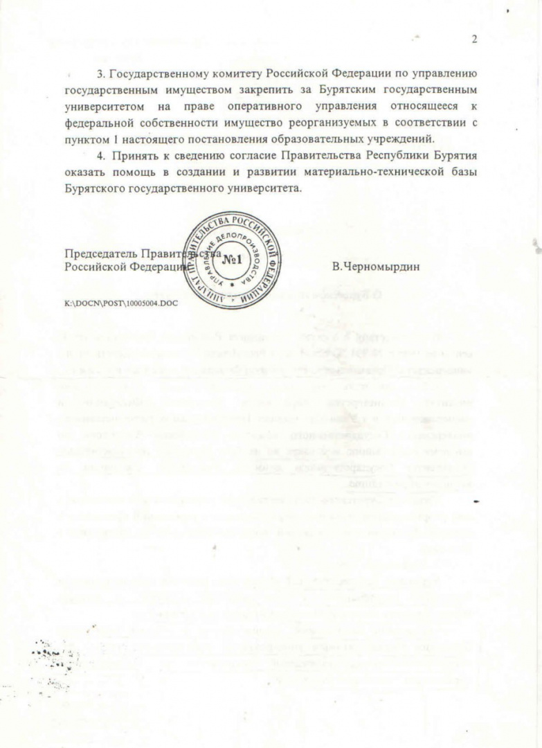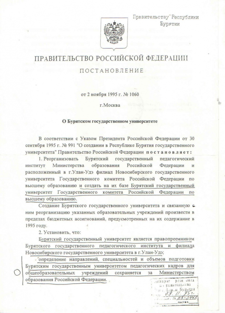 2 ноября 1995 г. вышло постановление Правительства Российской Федерации за подписью Председателя Правительства В. С. Черномырдина «О реорганизации Бурятского государственного пединститута и расположенного в г. Улан-Удэ филиала Новосибирского университета и создании на их базе Бурятского государственного университета».