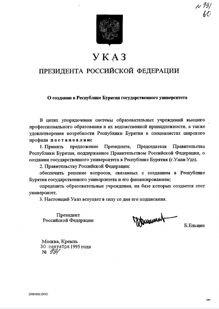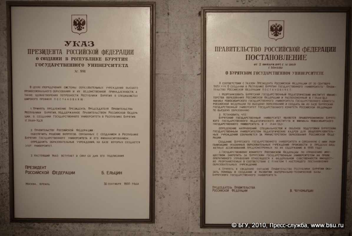 30 сентября 1995 г. был подписан указ Президента Российской Федерации Б.Н. Ельцина «О создании в Республике Бурятия государственного университета».