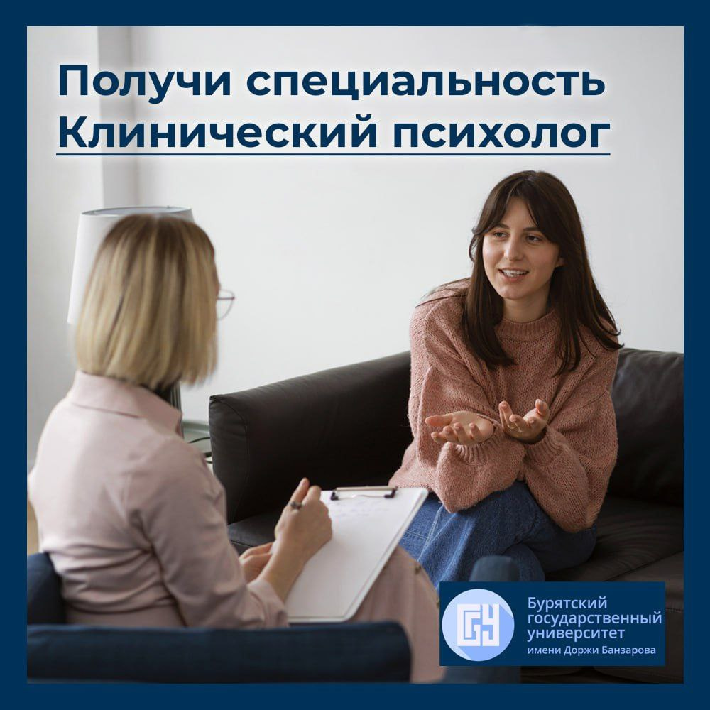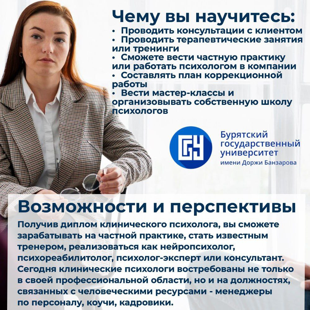 Институт педагогики и психологии Бурятского государственного университета имени Доржи Банзарова предлагает обучение по направлению «Клиническая психология». В вузе работают как научные сотрудники из разных областей (клинической психологии, медицины), так и специалисты-практики, за плечами которых богатый профессиональный опыт. Срок обучения составляет 5,5 лет. На это время молодым людям предоставляется отсрочка от армии. При поступлении на специальность «Клиническая психология» перед студентами открываются новые горизонты и возможности интересного пути их освоения.