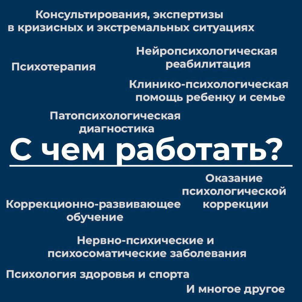 Компетенции клинического психолога охватывают изучение факторов дезадаптации и развития нервно-психических и психосоматических заболеваний, а также оказание психологической коррекции, психологического консультирования, психологической экспертизы в рамках кризисных и экстремальных ситуаций. Клиническая психология изучает такие области, как нейропсихологическая реабилитация, коррекционно-развивающее обучение, психотерапия, патопсихологическая диагностика, психология здоровья и спорта, клинико-психологическая помощь ребенку и семье и многое другое.