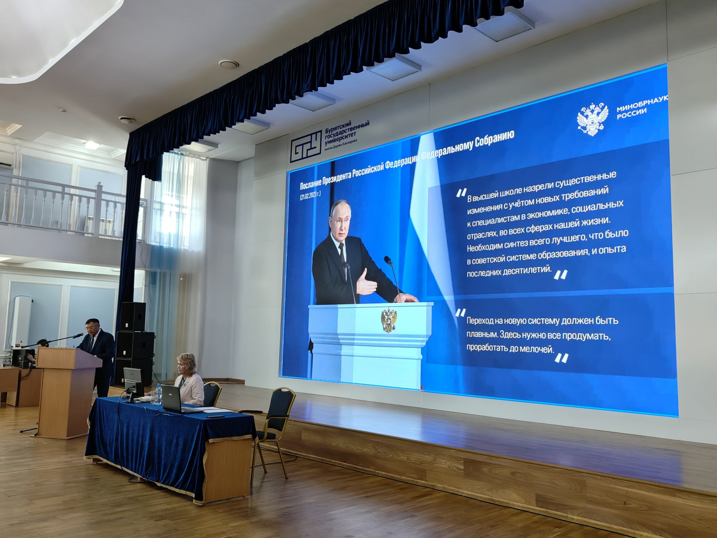 Ректор БГУ Дамдинов Алдар Валерьевич рассказал участникам ученого совета о новой модели высшего образования – основных принципах ее работы и новых подходах к подготовке кадров под существующие и будущие потребности экономики региона.