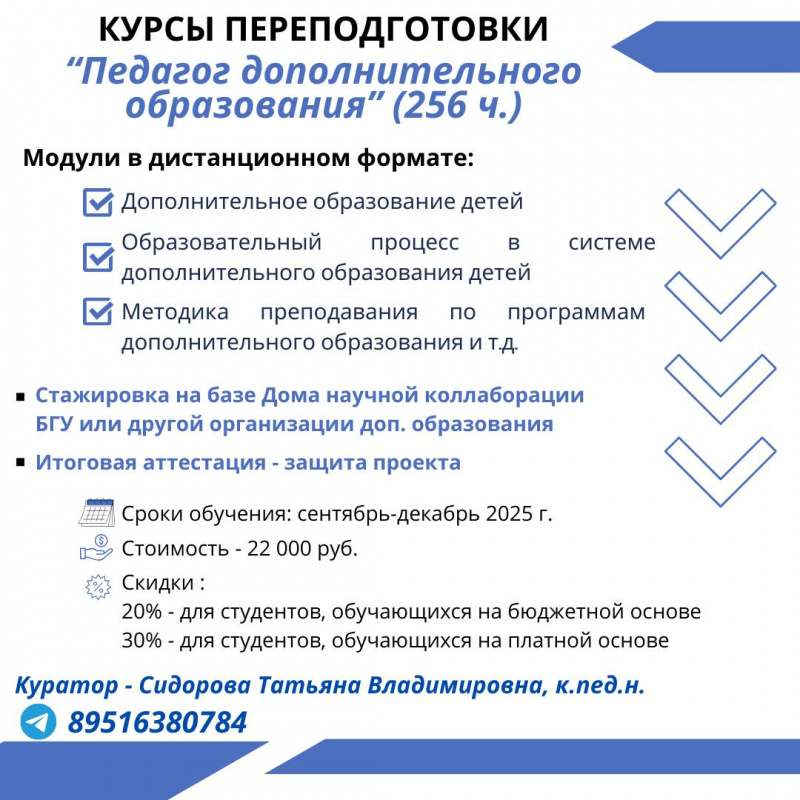 6 модулей в дистанционном формате (Дополнительное образование детей; Образовательный процесс в системе дополнительного образования детей; Методика преподавания по программам дополнительного образования детей и т.д.)