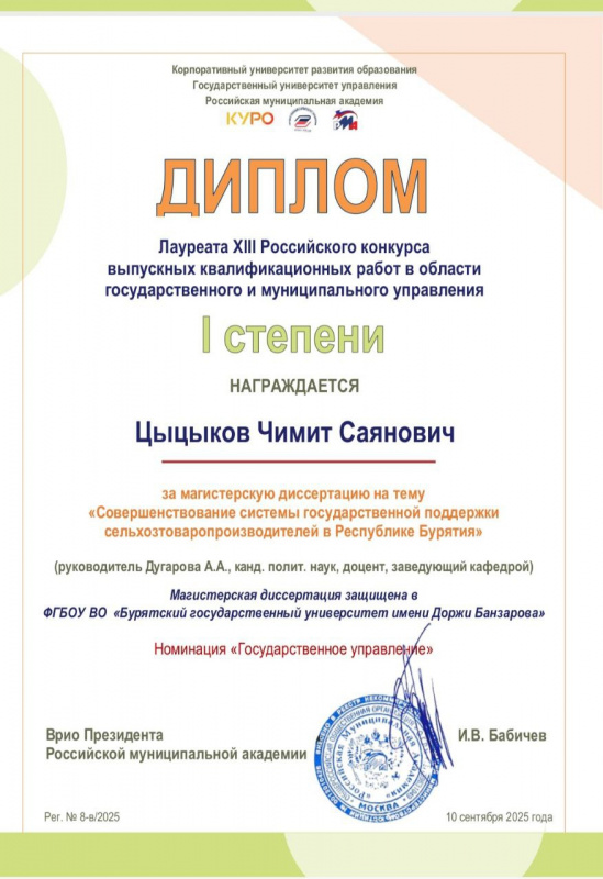 Дипломом 1 степени отмечена магистерская диссертация Цыцыкова Чимита Саяновича на тему «Совершенствование системы государственной поддержки сельхозтоваропроизводителей в Республике Бурятия». Научный руководитель: Дугарова А.А., канд.полит.наук, доцент.