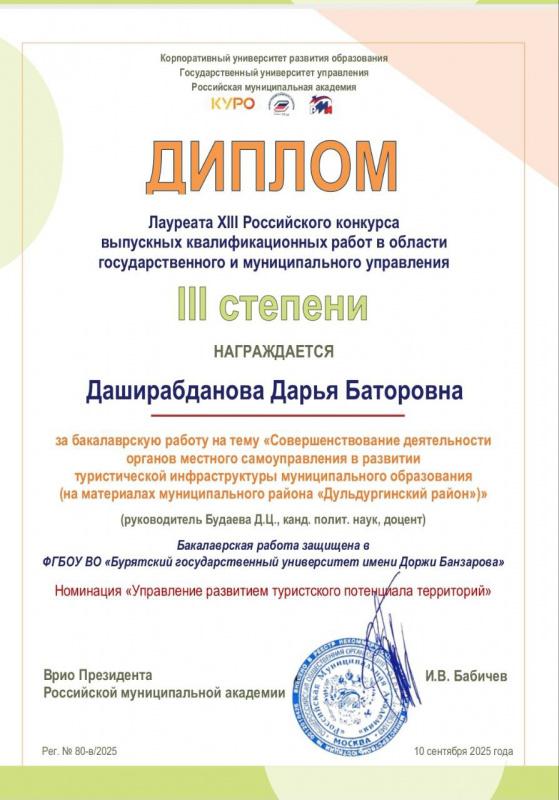 Диплом III степени заняла бакалаврская работа Даширабдановой Дарьи Баторовны на тему «Совершенствование деятельности органов местного самоуправления в развитии туристической инфраструктуры муниципального образования (на материалах муниципального района «Дульдургинский район»). Научный руководитель: Будаева Д.Ц., канд. полит. наук, доцент.