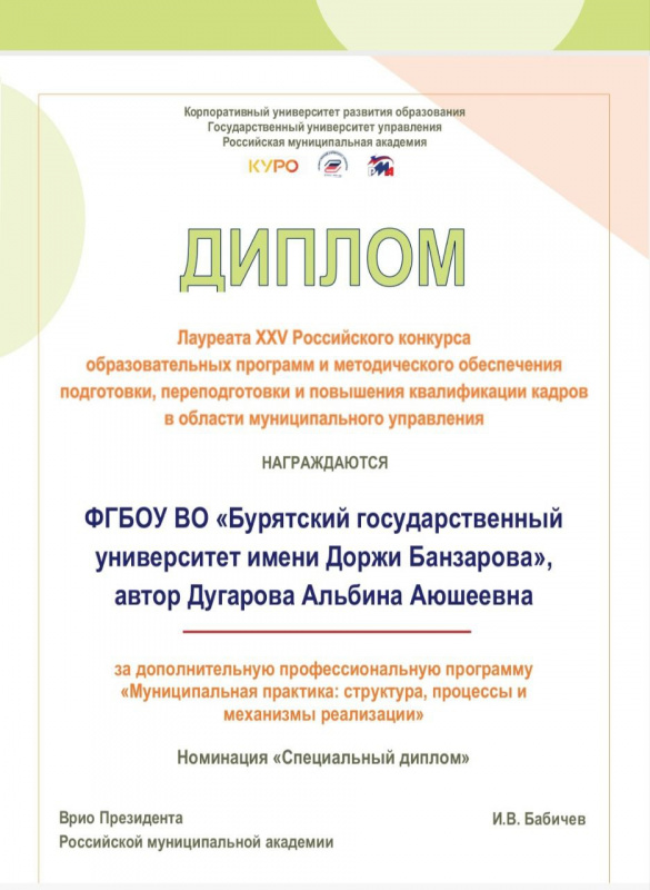 По итогам XXV Российского конкурса образовательных программ и методического обеспечения подготовки, переподготовки и повышения квалификации кадров для муниципального управления дополнительная профессиональная программа БГУ «Муниципальная практика: структура, процессы и механизмы реализации» по подготовке проектов на региональный этап Всероссийского конкурса «Лучшая муниципальная практика» отмечена в номинации «Специальный диплом».