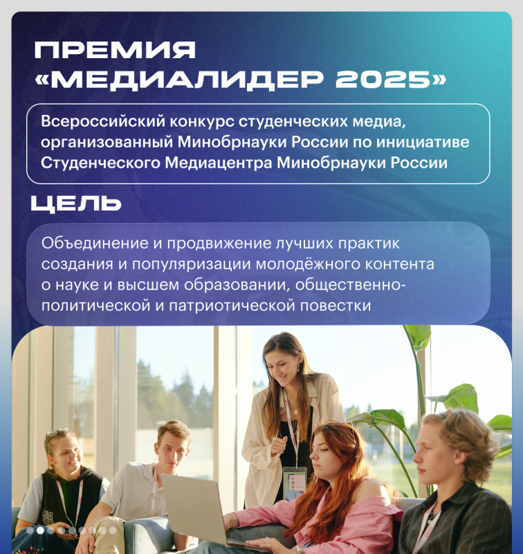 Премия «МедиаЛидер 2025» проводится с целью объединения и продвижения лучших практик создания и популяризации молодёжного контента о науке и высшем образовании, общественно-политической и патриотической повестки. Студенческие команды будут подавать заявки с презентациями созданных и реализованных медиапроектов по пяти номинациям:
