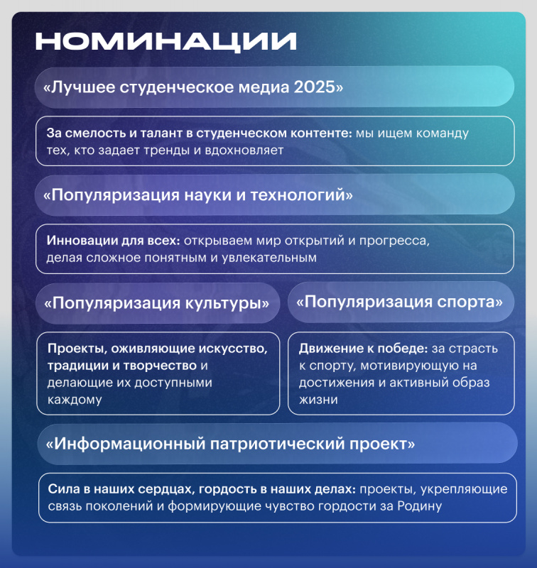 В рамках номинации «Лучшее студенческое медиа 2025» команды участников презентуют проекты своих студенческих СМИ. В номинации 2-5 принимаются медиапроекты, созданные в формате фото, видео, текста, социального плаката или карточек для социальных сетей. В каждой из номинаций будут определены топ-3 победителя.