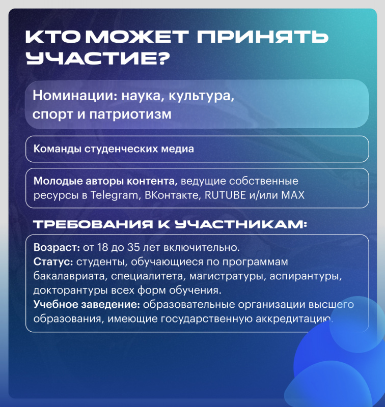 В каждой из номинаций предполагается командное участие, также студенты могут подать индивидуальную заявку по номинациям 2-5. Участниками конкурса могут стать студенты бакалавриата, специалитета и магистратуры всех форм обучения в возрасте от 18 до 35 лет, обучающиеся в высших учебных заведениях. Командное участие предполагает подачу заявки от редакции студенческого СМИ — медиацентра, творческого коллектива, профсоюза, спортивного клуба, научного сообщества, радио — любого студенческого объединения, активно ведущего аккаунты в социальных сетях.