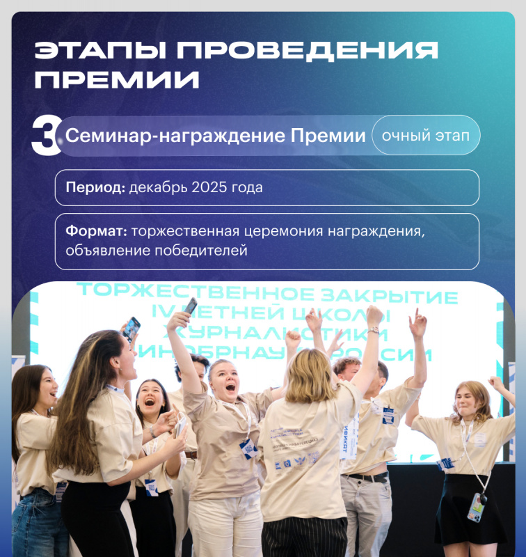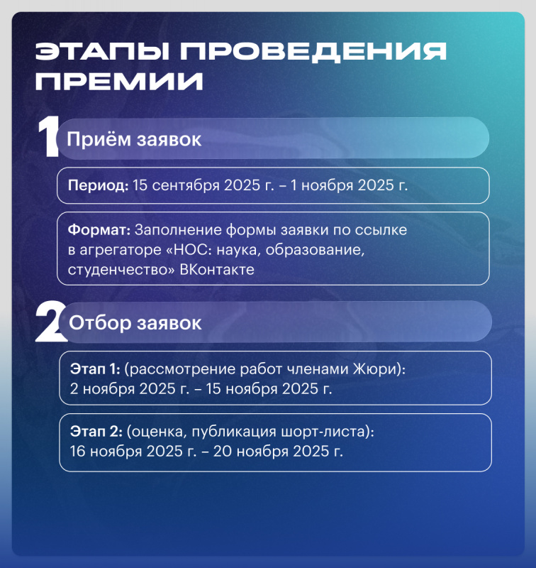 Подача заявок продлится до 1 ноября 2025 года, после чего к оцениванию работ приступит профессиональное жюри — эксперты Минобрнауки России и ведущие медиаспециалисты. Шорт-лист финалистов будет опубликован на ресурсах агрегатора студенческих СМИ «НОС: наука, образование, студенчество» — информационного партнёра проекта — до 20 ноября 2025 года. Финалисты всех номинаций отправятся на торжественную церемонию награждения в Москву, где будут оглашены победители Премии — они получат дипломы и ценные призы от организаторов и партнёров конкурса.
