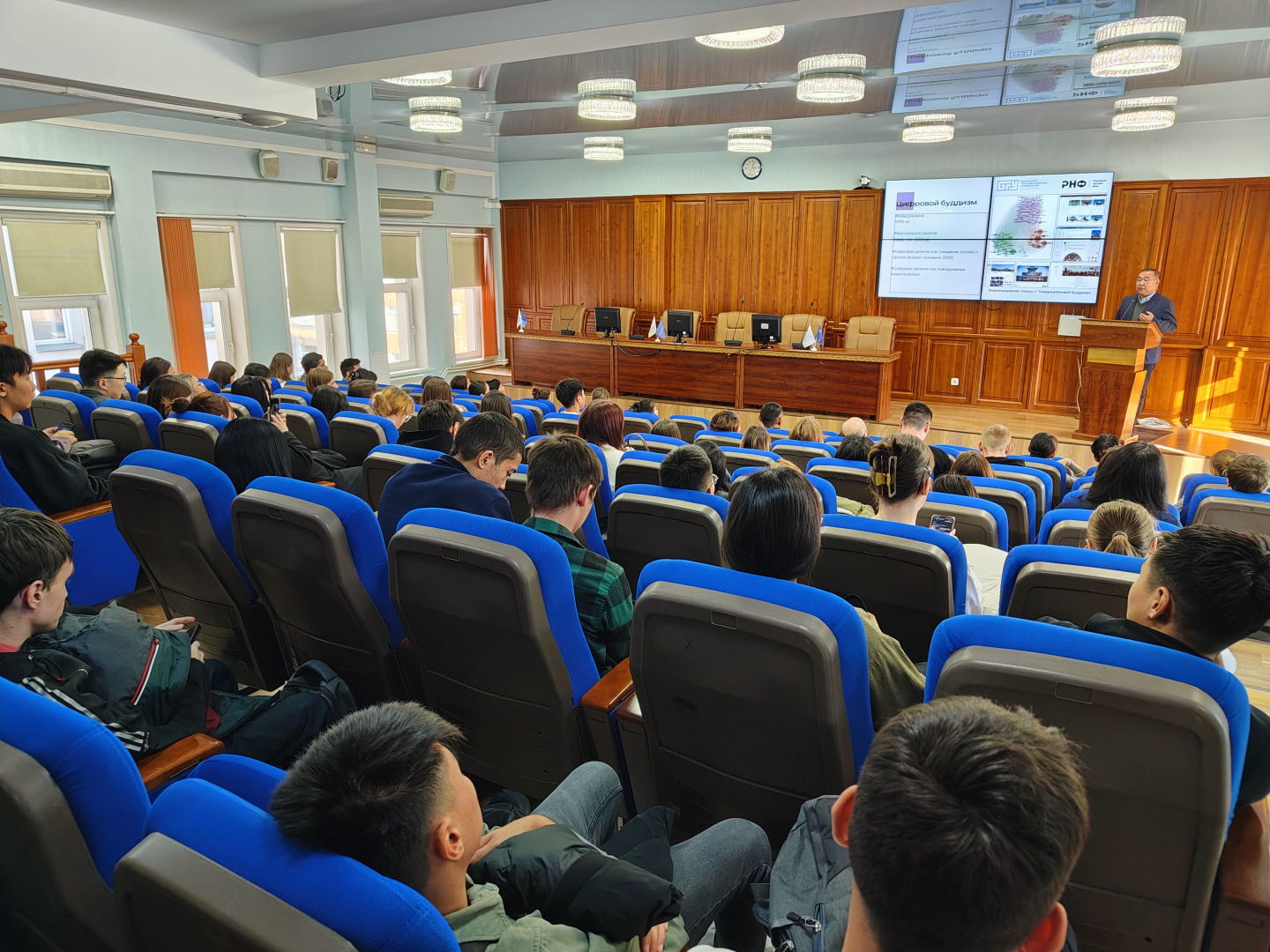Впервые в стенах Бурятского государственного университета прошла всероссийская просветительская акция «Лекторий РНФ». В рамках акции в период с 22 по 23 октября 2025 г. перед аудиторией выступили три ведущих преподавателя БГУ, победителя конкурсов грантов РНФ, которые представили свои текущие исследования и проекты: