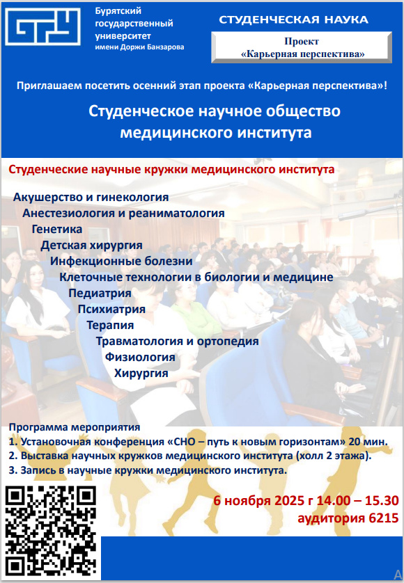 6 ноября в 14.00 в аудитории 6241 пройдет осенний этап проекта "Карьерная перспектива" - Студенческое научное общество медицинского института.