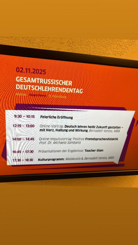 Тема конференции: «Немецкий язык: обучаем, делимся, вдохновляем». Данная конференция, участниками которой стали более 150 учителей немецкого языка, проходила одновременно в трех крупнейших городах Российской Федерации: в Москве, Санкт-Петербурге и Новосибирске.