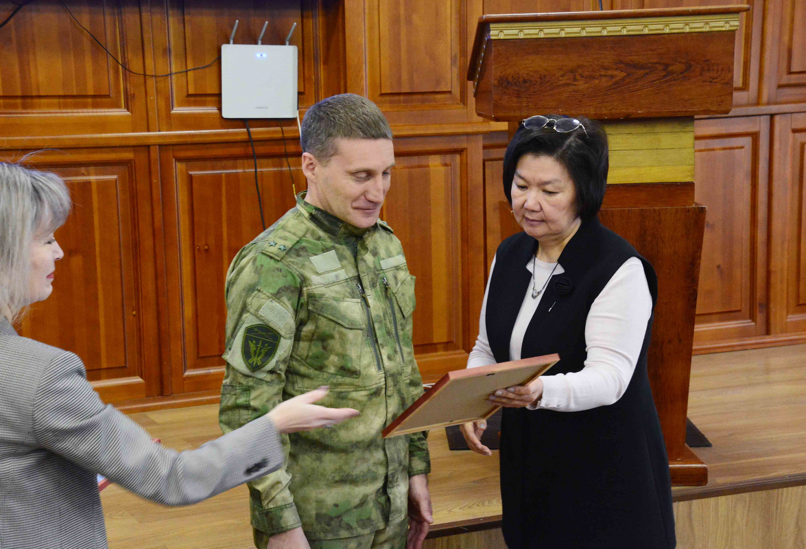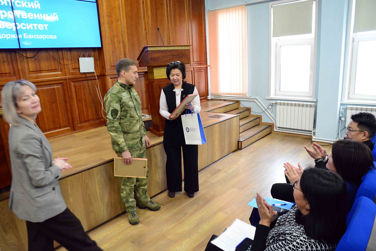 27 ноября на Ученом совете университета прошла торжественная церемония награждения. Министерство науки и высшего образования Российской Федерации совместно с руководством Бурятского государственного университета имени Доржи Банзарова выразили благодарность выпускнику университета, участнику специальной военной операции Харитонову Олегу Анатольевичу, отмеченному за значимый вклад в патриотическое воспитание молодежи.