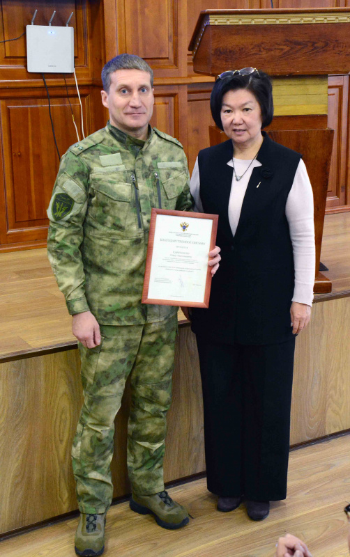 Проректор по научно-исследовательской работе Виктория Владимировна Номогоева вручила Харитонову О.А. Благодарственное письмо Министерства науки и высшего образования РФ за активное участие в проведении всероссийской акции «Победили тогда, победим и сейчас!». А также ему было вручено Благодарственное письмо Бурятского государственного университета. Виктория Владимировна горячо поблагодарила ветерана боевых действий за плодотворное сотрудничество, активную позицию, отзывчивость , участие в просветительской деятельности и воспитании молодежи.