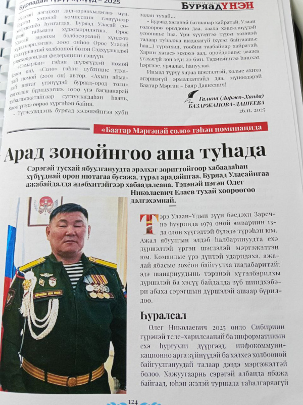 07 декабря 2025 года в Улан-Удэ состоялась торжественная церемония награждения лауреатов 26-го конкурса «Лучшие люди Бурятии». В номинации «Баатарай соло» («Восхваление Героя») дипломантом стал Елаев Олег Николаевич, магистрант 1 курса Бурятского государственного университета имени Доржи Банзарова, обучающийся по направлению подготовки 38.04.01 «Экономика».
