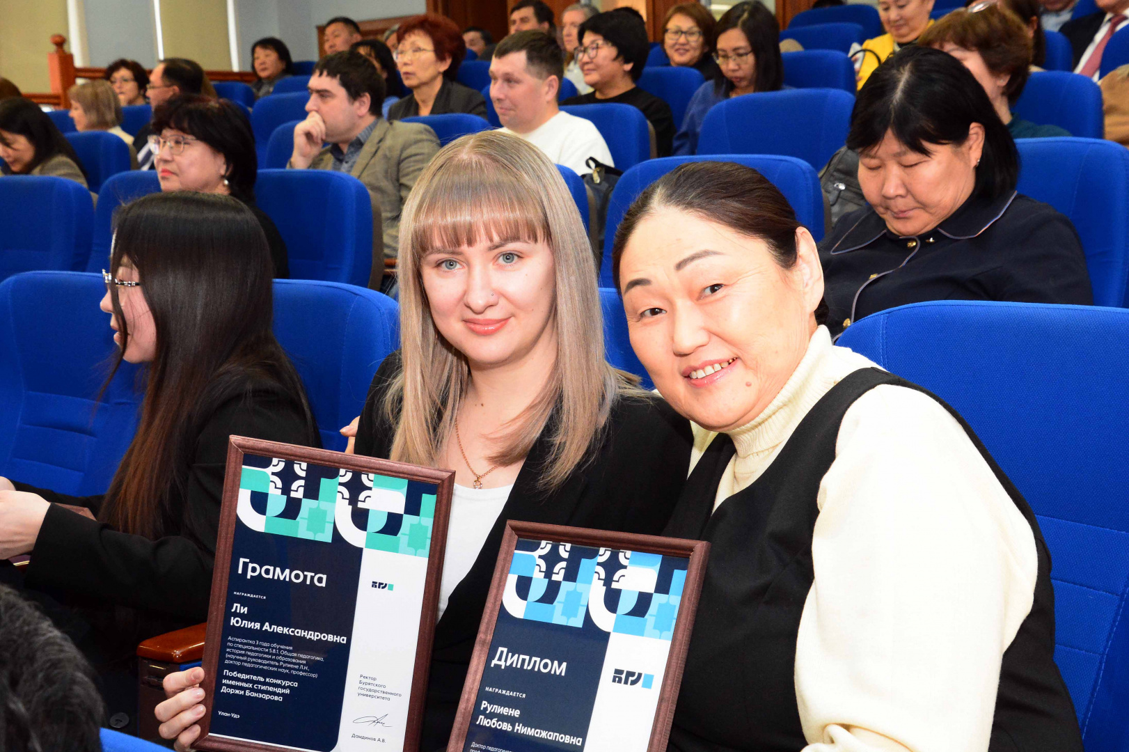 Далее были подведены итоги конкурса грантов Бурятского государственного университета и награждены его победители. Из 40 заявок по результатам отбора 10 проектов получат финансовую поддержку университета на проведение инициативных и инновационных научных исследований.