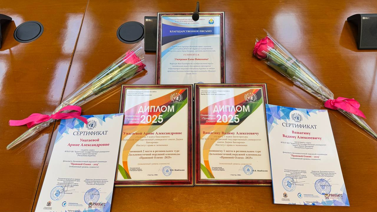 Сегодня, 13 февраля 2026 года, студенты Института права и экономики – Вашагин Вадим и Унагаева Арина, совместно с заместителем директора по научной работе, к.ю.н., доцентом кафедры УППК – Гулиной Еленой Витальевной, приняли участие в работе итогового совещания Уполномоченного по правам человека в Республике Бурятия за 2025 год. В рамках совещания дипломами и благодарственными письмами были награждены лучшие школьники, студенты и их преподаватели, которые проявили себя.