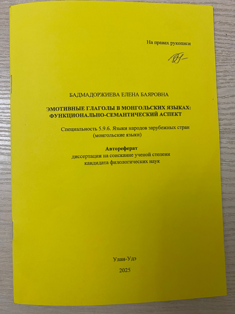 В диссертационном совете 24.1.083.02 на базе ИМБТ СО РАН 12 февраля 2026 г. состоялась успешная защита диссертации Бадмадоржиевой Елены Баяровны «Эмотивные глаголы в монгольских языках: функционально-семантический аспект» на соискание ученой степени кандидата филологических наук по специальности 5.9.6. Языки народов зарубежных стран (монгольские науки).