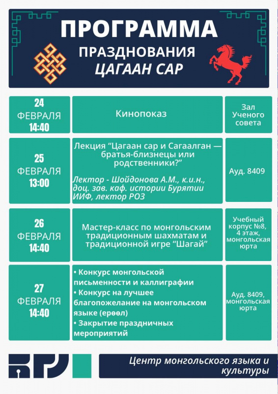 Центр монгольского языка и культуры Бурятского государственного университета приглашает студентов, преподавателей и всех желающих принять участие в мероприятиях, посвященных празднованию традиционного праздника Цагаан сар, которые будут проходить с 24 по 27 февраля 2026 года в учебном корпусе № 8.