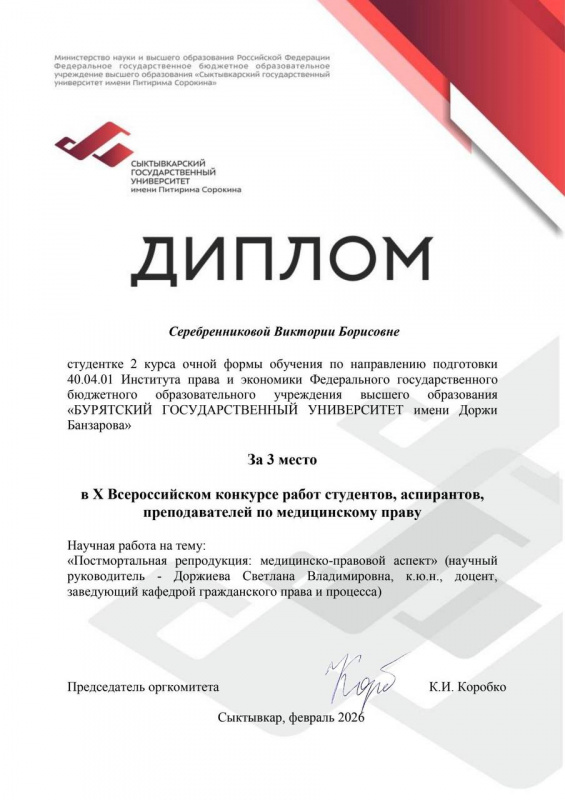 В номинации «Научно-исследовательская работа» магистрант 2 курса ИПЭ БГУ Серебренникова Виктория заняла третье место с исследованием «Постмортальная репродукция: медицинско-правовой аспект» (научный руководитель - Доржиева Светлана Владимировна, к.ю.н., доцент, заведующий кафедрой гражданского права и процесса).