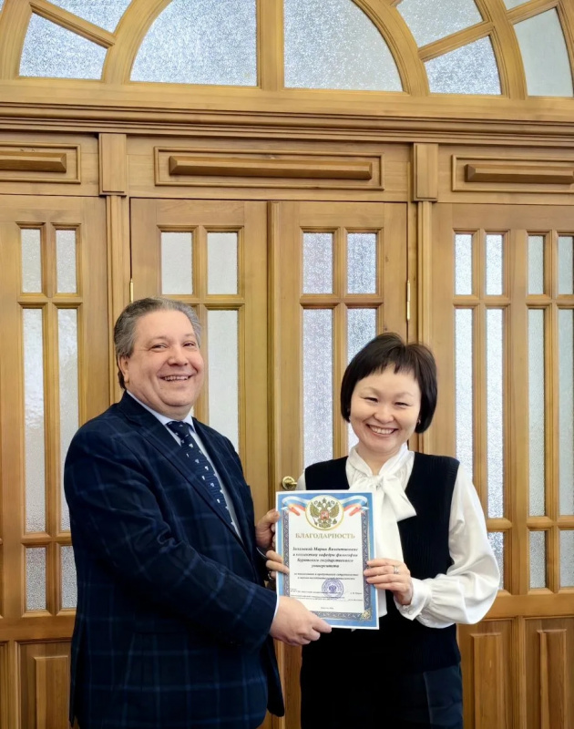 Ректор Иркутского государственного университета д. хим.наук, проф. А.Ф. Шмидт вручил заведующей кафедрой философии д.филос.наук, проф, М.В. Золхоевой и коллективу кафедры философии благодарность за многолетнее и продуктивное сотрудничество в научно-исследовательской деятельности.