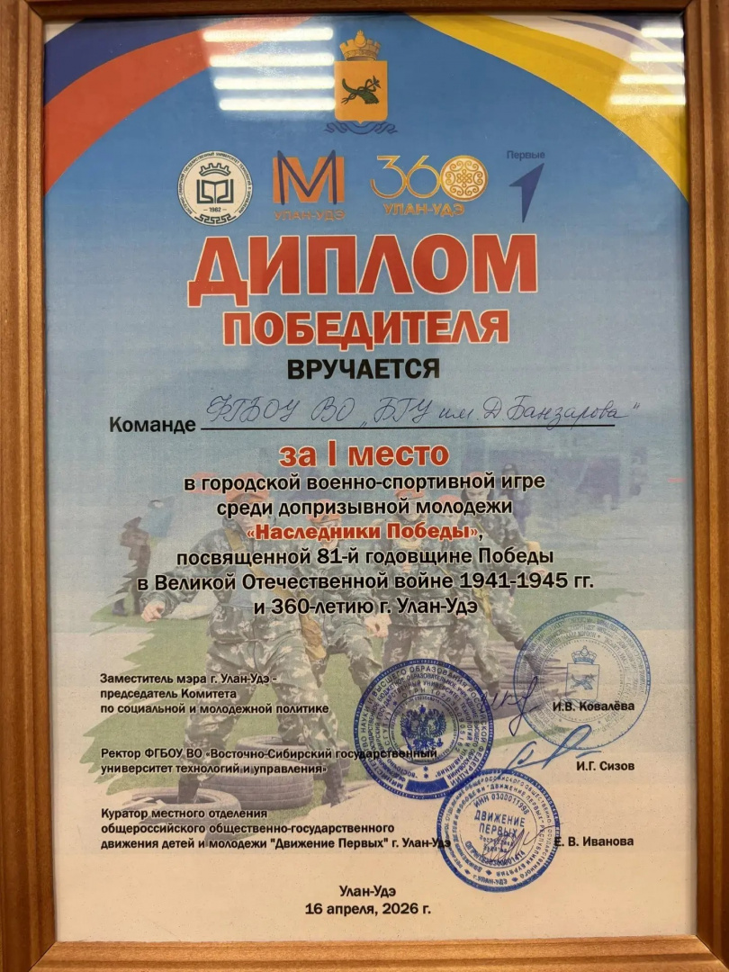 Наша команда спортивно-патриотического клуба БГУ «Бухэ-Бургэд» в очередной раз продемонстрировала свои высокие военно-патриотические навыки и стала ПОБЕДИТЕЛЕМ городской военно-спортивной игры среди допризывной молодёжи «Наследники Победы».