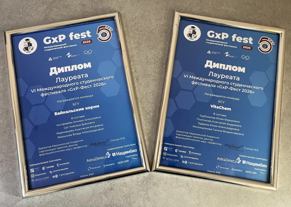 Две студенческие команды медицинского института (кафедра фармации) Бурятского государственного университета: «VitaChem» и «Байкальские корни» стали лауреатами VI Международного фестиваля «GxP-Фест 2026» в Москве.